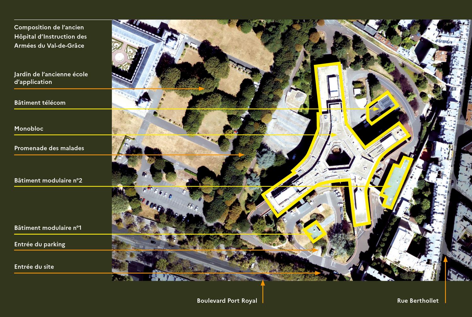 La partie historique du site restera quant à elle affectée au ministère des Armées. Elle comprend l’abbaye fondée en 1624 ainsi que l’école du service de santé des armées du Val-de-Grâce. Les bâtiments ainsi que les sols et sous-sols sont classés au titre des monuments historiques. Le jardin attenant à l’Abbaye du Val-de-Grâce est classé Espace Vert Protégé au titre du Plan Local d’Urbanisme.