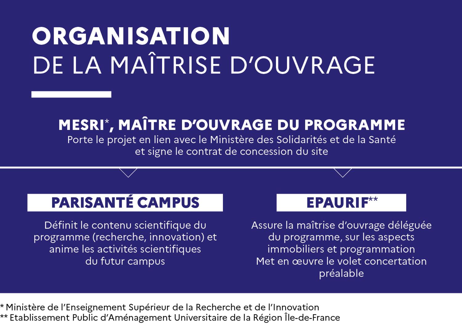L’Établissement Public d’Aménagement Universitaire de la Région Ile-de-France (EPAURIF) a été mandaté par le MESRI pour assurer la maîtrise d’ouvrage déléguée sur le programme, sur les aspects suivants : conduite de l’opération immobilière, pilotage des études de programmation et de conception du programme et suivi des dispositifs d’accompagnement et de conseil, notamment sur le volet de la concertation préalable.